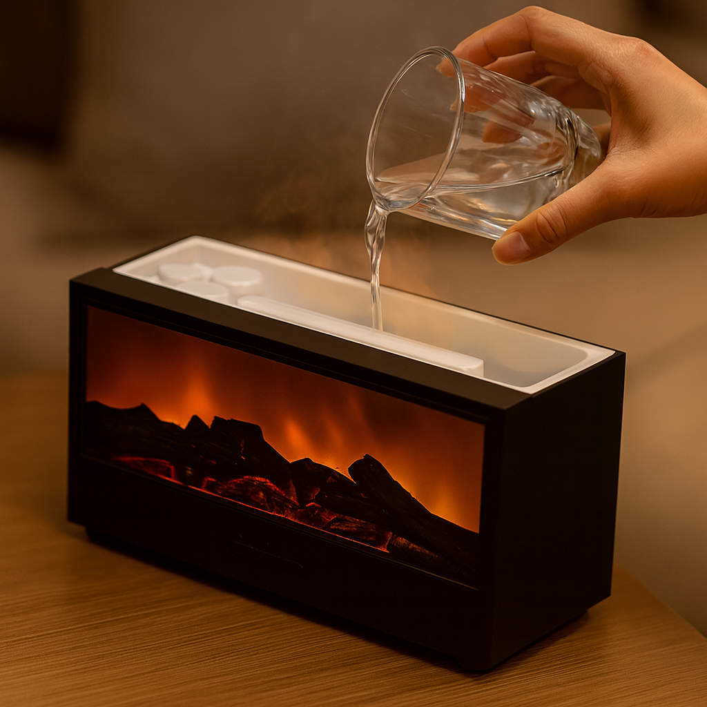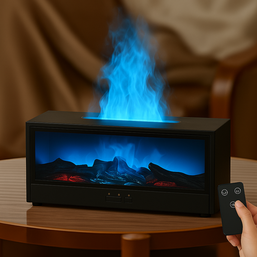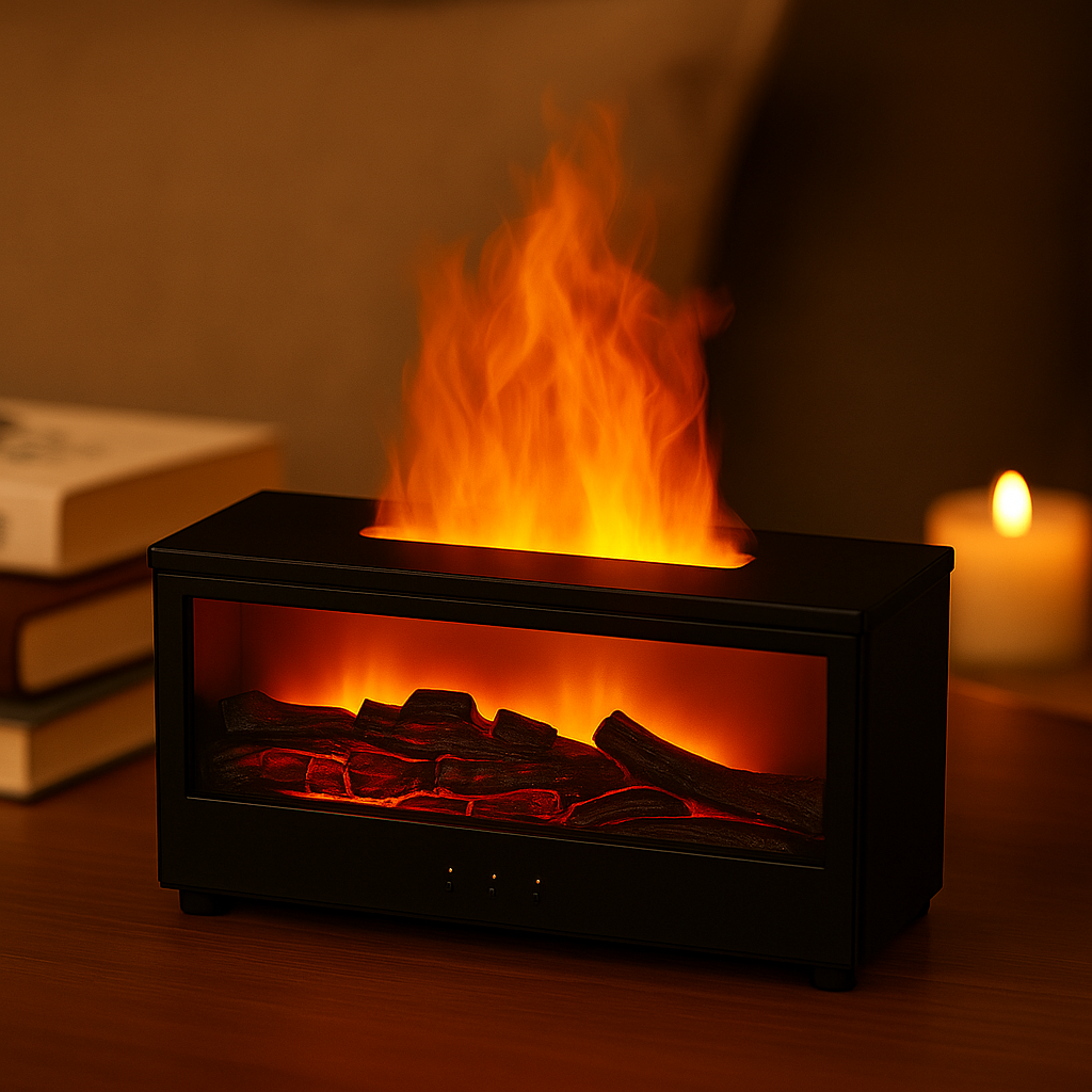 Nie – efekt wizualny to bezpieczna imitacja płomienia osiągnięta przez podświetlenie LED i ultradźwiękową mgiełkę. Urządzenie pozostaje chłodne w dotyku i jest w pełni bezpieczne.